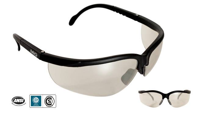 Anteojo de seguridad Libus modelo MIG OUT DOOR/IN DOOR medio marco con puente nasal universal y apoyo de silicona para evitar deslizamientos. Presenta lentes de policarbonato con filtro UV y un tratamiento a través de una película levemente metalizada que atenúa la luz artificial como natural. Ideal para usuarios que deben realizar sus actividades alternando diferentes ambientes internos y externos.