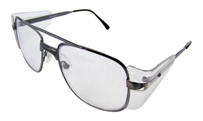 Anteojo de seguridad que presenta marco metalico y armazon con proteccion lateral. Es apto para su utilización con cristales recetados.