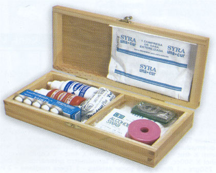 Botiquin de madera laqueada natural es un elemento de primeros auxilios que se encuentra impreso a tres colores. Medidas: 230mm(largo), 105mm(ancho), 45mm(alto). Contiene 14 unidades.