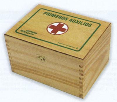 Botiquin de madera laqueada natural que contiene elementos de primeros auxilios. Se encuentra impreso a tres colores. Medidas: 185mm(largo), 138mm(ancho), 105mm(alto). Contiene 20 unidades.