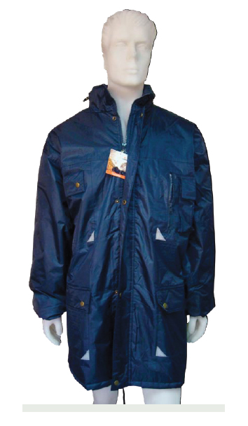 Campera de abrigo impermeable tipo parka IMPORTADA, confeccionada en tela polyester 100% y rellena con fibra de polyester. Posee apliques de reflectivo. El interior de la prenda se encuentra forrado con matelaseado romboidal. Presenta una capucha ajustable, plegada dentro del cuello de la prenda. 4 bolsillos exteriores + 1 bolsillo porta celular + 1 bolsillo interno con cierre. Cierre con solapa y botones metálicos a presión.