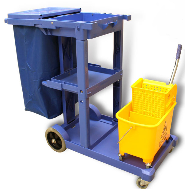 Carro de limpieza porta materiales para empresas e industrias. Es un elemento que se encuentra fabricado en polipropileno. Contiene paneles para distribuir los productos de limpieza, porta escobas, area para cubeta exprimidor o bote, bolsa de vinil muy resistente, ruedas de hule para su transportacion.